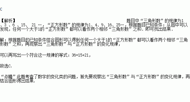古希腊著名的毕达哥拉斯学派把1、3、6、10 … 这样的数称为“三角形数”,而把1、4、9、16…这样的数称为“正方形数”.从图中可以发现,任何一个大于1的“正方形数”都可以看作两个相邻“三角形数”之和.则下列符合这一规律的等式是( )