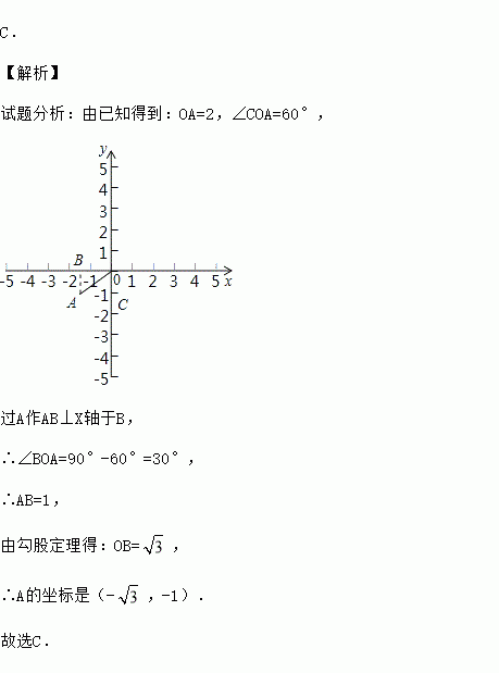 在直角坐标平面内的机器人接受指令“[a,A]”(a≥0,0°<A<180°)后的行动结果为:在原地顺时针旋转A后,再向正前方沿直线行走a个单位长度.若机器人的位置在原点,正前方为y轴的负半轴,则它完成一次指令[2,60°]后位置的坐标为( )