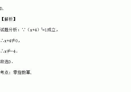 D. 【解析】 试题分析:∵(x+4)0=1成立, ∴x+4≠0, ∴x≠-4. 故选D. 考点: 零指数幂.