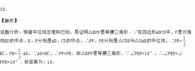 如图,在四边形ABCD中,P是对角线BD的中点,E,F分别是AB,CD的中点,AD=BC,∠PEF=18°,则∠PFE的度数是 度.