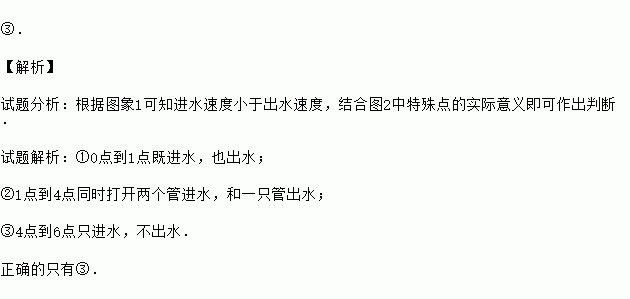 为了增强抗旱能力,保证今年夏粮丰收,某村新修建了一个蓄水池,这个蓄水池安装了两个进水管和一个出水管(两个进水管的进水速度相同)一个进水管和一个出水管的进出水速度如图1所示,某天0点到6点(至少打开一个水管),该蓄水池的蓄水量如图2所示,并给出以下三个论断:①0点到3点只进水不出水;②3点到4点不进水只出水;③4点到6点不进水不出水.则一定能确定正确的论断是
