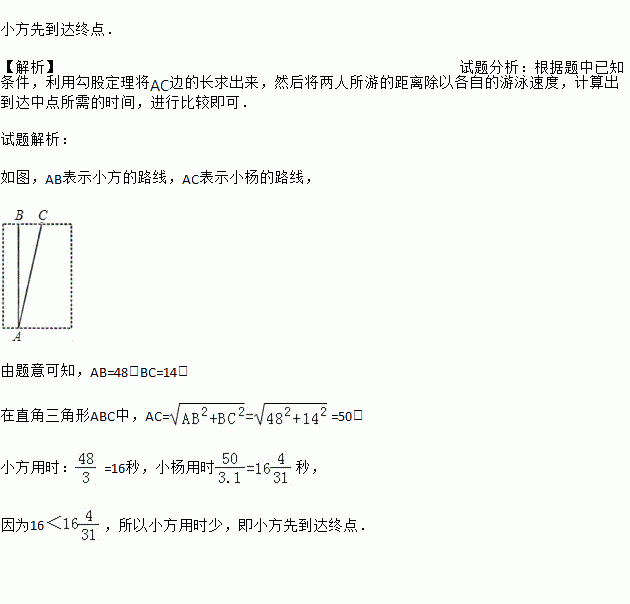 如图,某游泳池长48米,小方和小杨进行游泳比赛,从同一处(A点)出发,小方平均速度为3米/秒,小杨为3.1米/秒.但小杨一心想快,不看方向沿斜线(AC方向)游,而小方直游(AB方向),两人到达终点的位置相距14米.按各人的平均速度计算,谁先到达终点,为什么?