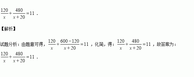 某市为治理污水,需要铺设一段全长600m的污水排放管道,铺设120m后,为加快施工进度,后来每天比原计划增加20m,结果共用11天完成这一任务,求原计划每天铺设管道的长度.如果设原计划每天铺设xm管道,那么根据题意,可列方程 .