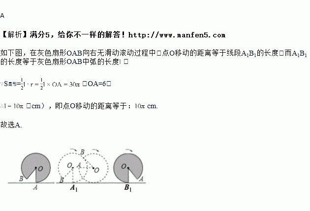 如图,水平地面上有一面积为30cm2的灰色扇形OAB,其中OA=6cm,且OA垂直于地面.将这个扇形向右滚动(无滑动)至点B刚好接触地面为止,则在这个滚动过程中,点O移动的距离是( )![]()