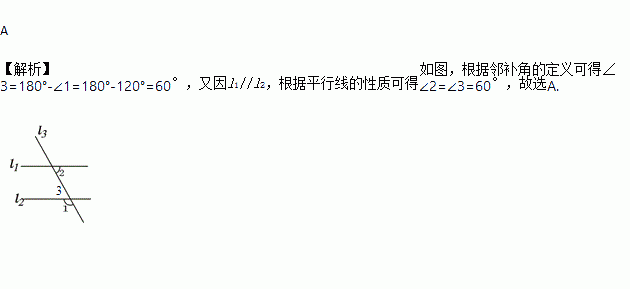 如图,直线l1、l2与直线l3相交,若l1//l2 ,?1=120º,则?2=( )