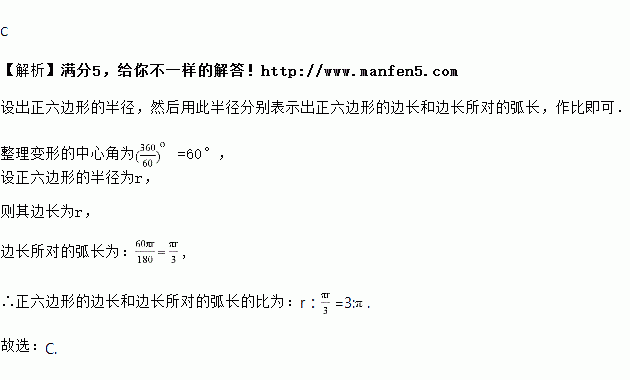 圆内接正六边形的边长与该边所对的劣弧的长的比是( )