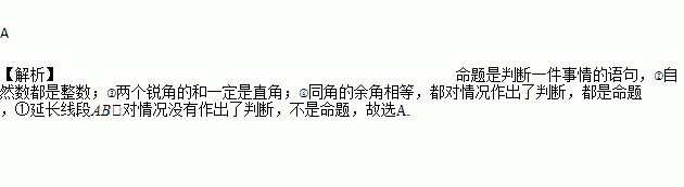 ①延长线段AB;②自然数都是整数;③两个锐角的和一定是直角;④同角的余角相等.