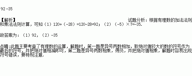 计算:(1)120+(-28)=_________,(2)(-5)×7=_________.