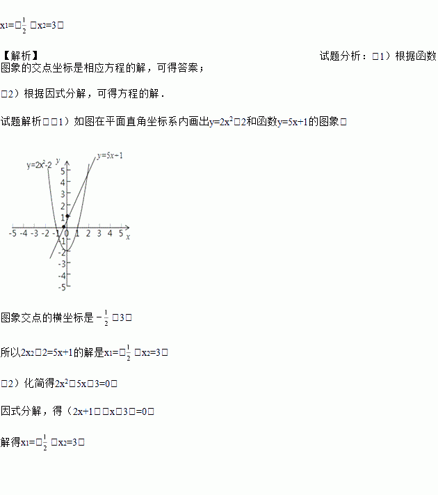 x1=﹣,x2=3. 【解析】试题分析:(1)根据函数图象的交点坐标是相应方程的解,可得答案; (2)根据因式分解,可得方程的解. 试题解析:(1)如图在平面直角坐标系内画出y=2x2﹣2和函数y=5x+1的图象, 图象交点的横坐标是﹣,3, 所以2x2﹣2=5x+1的解是x1=﹣,x2=3; (2)化简得2x2﹣5x﹣3=0, 因式分解,得(2x+1)(...