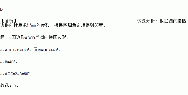 D 【解析】试题分析:根据圆内接四边形的性质求出∠B的度数,根据圆周角定理得到答案. 【解析】 ∵四边形ABCD是圆内接四边形, ∴∠ADC+∠B=180°,又∠ADC=140°, ∴∠B=40°, ∴∠AOC=2∠B=80°, 故选:D.