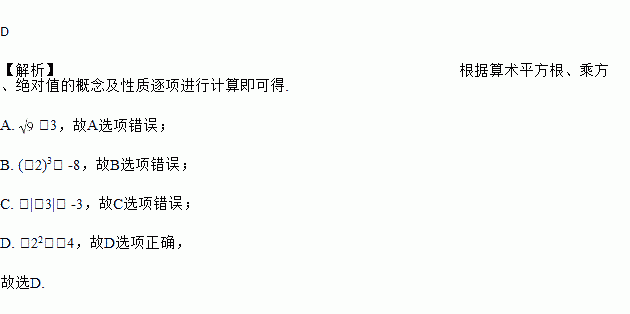 A. =±3 B. (-2)3=8 C. -|-3|=3 D. -22=-4