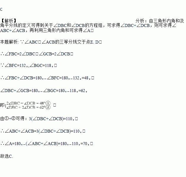 如图,△ABC, ∠ABC、∠ACB的三等分线交于点E、D,若∠BFC=132°,∠BGC=118°,则∠A的度数为( )