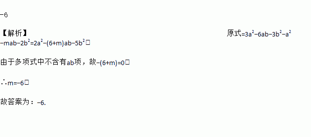 -6 【解析】原式=3a2?6ab?3b2?a2?mab?2b2=2a2?(6+m)ab?5b2, 由于多项式中不含有ab项,故?(6+m)=0, ∴m=?6, 故答案为:?6.