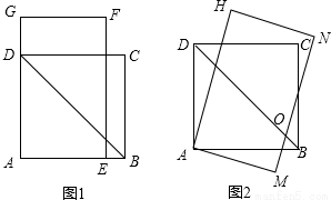 如图1,四边形ABCD是边长为的正方形,矩形AEFG中AE=4,∠AFE=30°。将矩形AEFG绕点A顺时针旋转15°得到矩形AMNH(如图2),此时BD与MN相交于点O.