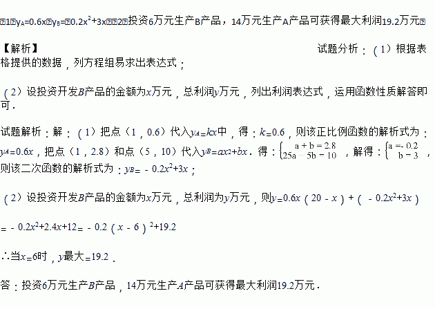 (2)如果公司准备投资20万元同时开发A、B两种新产品,请你设计一个能获得最大利润的投资方案,并求出按此方案能获得的最大利润是多少万元?