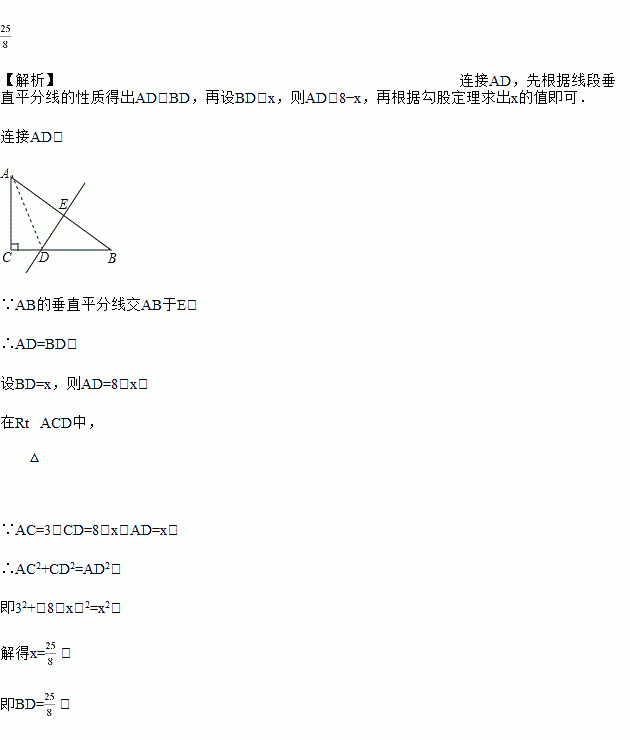 如图,△ABC中,∠C=90°,AC=3,BC=4,AB的垂直平分线交AB于E,交BC于D,求BD的长.
