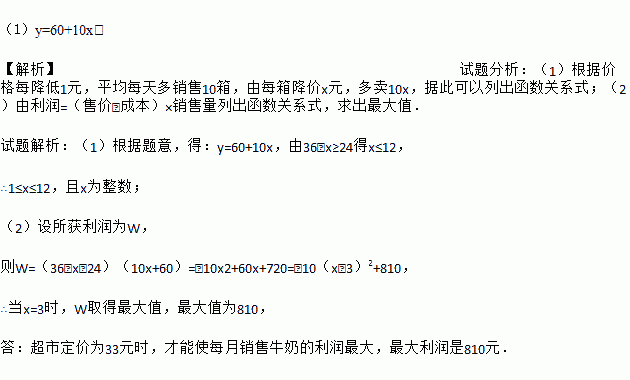 (1)y=60+10x, 【解析】试题分析:(1)根据价格每降低1元,平均每天多销售10箱,由每箱降价x元,多卖10x,据此可以列出函数关系式;(2)由利润=(售价﹣成本)×销售量列出函数关系式,求出最大值. 试题解析:(1)根据题意,得:y=60+10x,由36﹣x≥24得x≤12, ∴1≤x≤12,且x为整数; (2)设所获利润为W, 则W=(36﹣x﹣24)(1...