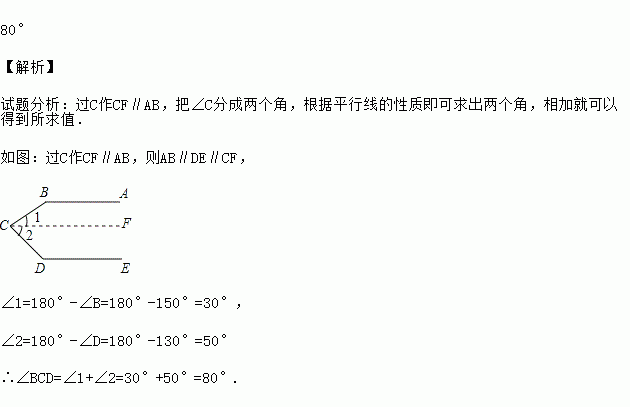 如图,BA∥DE,∠B=150°,∠D=130°,则∠C的度数是__________。