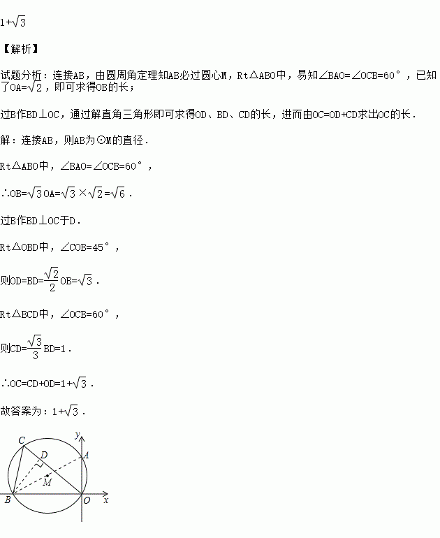 如图所示:在平面直角坐标系中,△OCB的外接圆与y轴交于A(0,),∠OCB=60°,∠COB=45°,则OC= .