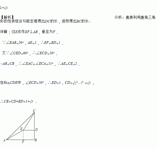 如图所示,在Rt△ABC中,AB=CB,ED⊥CB,垂足为D点,且∠CED=60°,∠EAB=30°,AE=2,求CB的长.
