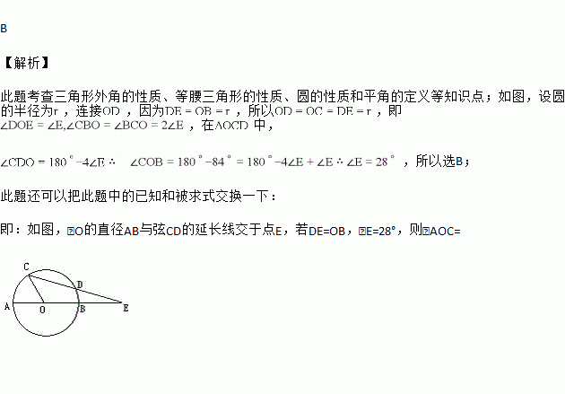 如图,⊙O的直径AB与弦CD的延长线交于点E,若DE=OB,∠AOC=84°,则∠E等于( )