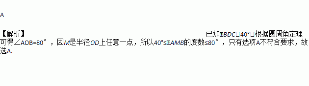 如图,A,B,C,D是⊙O上的四个点,B是的中点,M是半径OD上任意一点.若∠BDC=40°,则∠AMB的度数不可能是( )