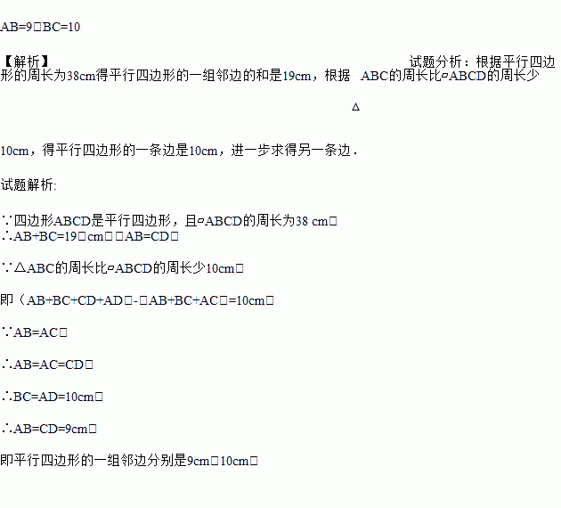 如图,在□ABCD中,AB=AC,若□ABCD的周长为38 cm,△ABC的周长比□ABCD的周长少10 cm,求□ABCD的一组邻边的长.