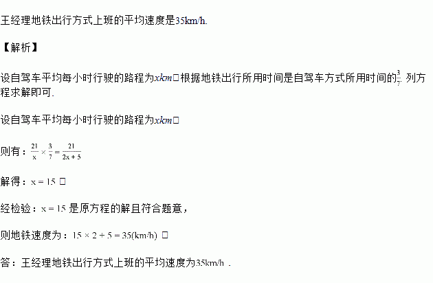 为了“绿色出行”,王经理上班出行由自驾车改为乘坐地铁出行,已知他家距上班地点21千米,他用地铁方式平均每小时出行的路程,比用自驾车平均每小时行驶的路程的2倍还多5千米,他从家出发到达上班地点,地铁出行所用时间是自驾车方式所用时间的
