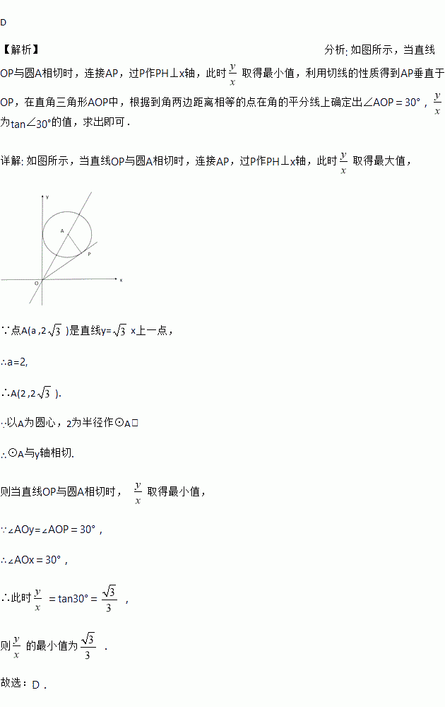 在平面直角坐标系中,点A(a ,2)是直线y=x上一点,以A为圆心,2为半径作⊙A,若P(x,y)是第一象限内⊙A上任意一点,则的最小值为( )