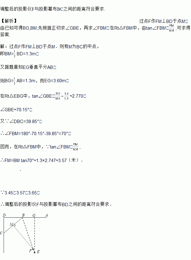 £¬´ËʱͶӰÒÇEµ÷Õûµ½Ïß¶ÎEBÉϵĵãF´¦ÇÒÇ¡ºÃÕý¶ÔͶӰϲ¼BCµÄÖÐÑ룮ÈôͶӰÒÇÓëͶӰϲ¼µÄ°²×°¾àÀë¿ØÖÆÔÚ3.45Ã×µ½3.65Ã×Ö®¼äЧ¹û×îºÃ£¬Ôòµ÷ÕûºóµÄͶӰÒÇFÓëͶӰϲ¼BCÖ®¼äµÄ¾àÀëÊÇ·ñ·ûºÏÒªÇó£¿Çëͨ¹ý¼ÆËã¼ÓÒÔ˵Ã÷£®![]()