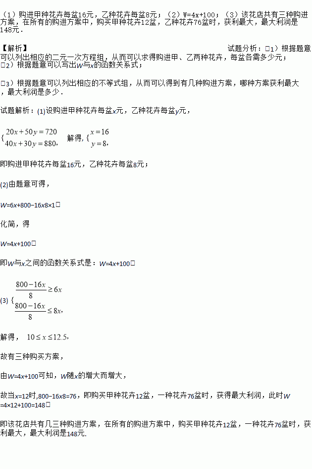 £¨3£©ÔÚ£¨2£©µÄÌõ¼þÏ£¬¿¼Âǵ½¹Ë¿ÍÐèÇó£¬ÒªÇ󹺽øÒÒÖÖ»¨»ÜµÄÊýÁ¿²»ÉÙÓÚ¼×ÖÖ»¨»ÜÊýÁ¿µÄ6±¶£¬ÇÒ²»³¬¹ý¼×ÖÖ»¨»ÜÊýÁ¿µÄ8±¶£¬ÄÇô¸Ã»¨µê¹²Óм¸ÖÖ¹º½ø·½°¸£¿ÔÚËùÓеĹº½ø·½°¸ÖУ¬ÄÄÖÖ·½°¸»ñÀû×î´ó£¿×î´óÀûÈóÊǶàÉÙÔª£¿