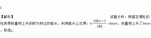 C 【解析】试题分析:根据定滑轮的性质得到重物上升的即为转过的弧长,利用弧长公式得:l==3πcm,则重物上升了3πcm,故选C.