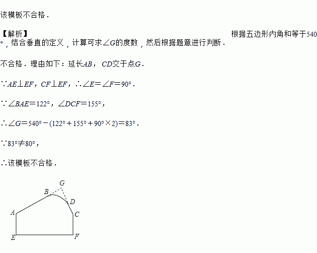 如图所示为一模板,按规定AB,CD的延长线相交应成80°的角,因交点不在板上,测量后质检员测得∠BAE=122°,∠DCF=155°,如果你是质检员,如何知道模板是否合格?为什么?