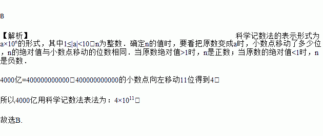 近几年,襄阳市经济呈现稳中有进,稳中向好的态势,2017年GDP突破4000亿元大关,4000亿这个数用科学记数法表示为( )