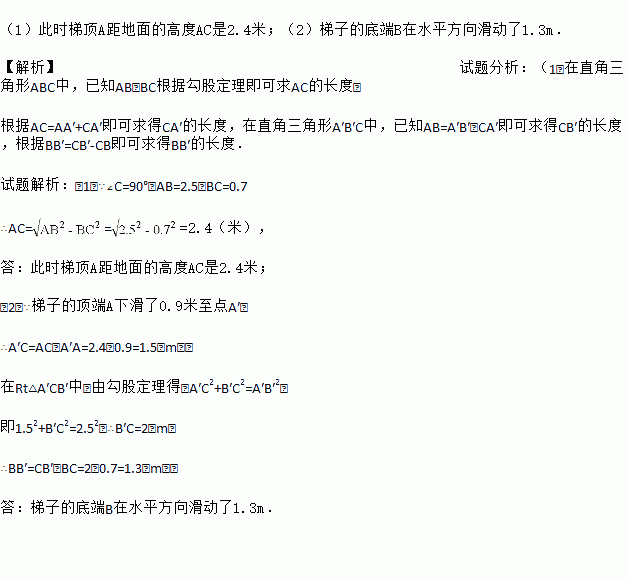 (2)如果梯子的顶端A下滑了0.9m,那么梯子的顶端B在水平方向上向右滑动了多远?