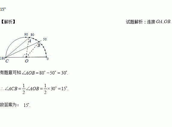 如图,量角器外缘上有A、B两点,它们所表示的读数分别是80°、50°,则∠ACB的度数为_____.