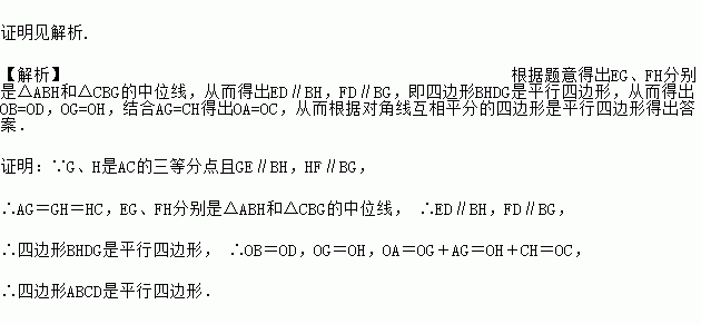 如图,已知G、H是△ABC的边AC的三等分点,GE∥BH,交AB于点E,HF∥BG交BC于点F,延长EG、FH交于点D,连接AD、DC,设AC和BD交于点O,求证:四边形ABCD是平行四边形.