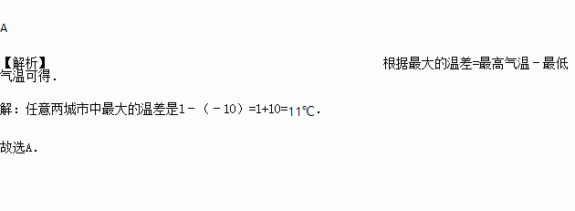 冬季某天我国三个城市的最高气温分别是﹣10℃,1℃,﹣7℃,它们任意两城市中最大的温差是( )