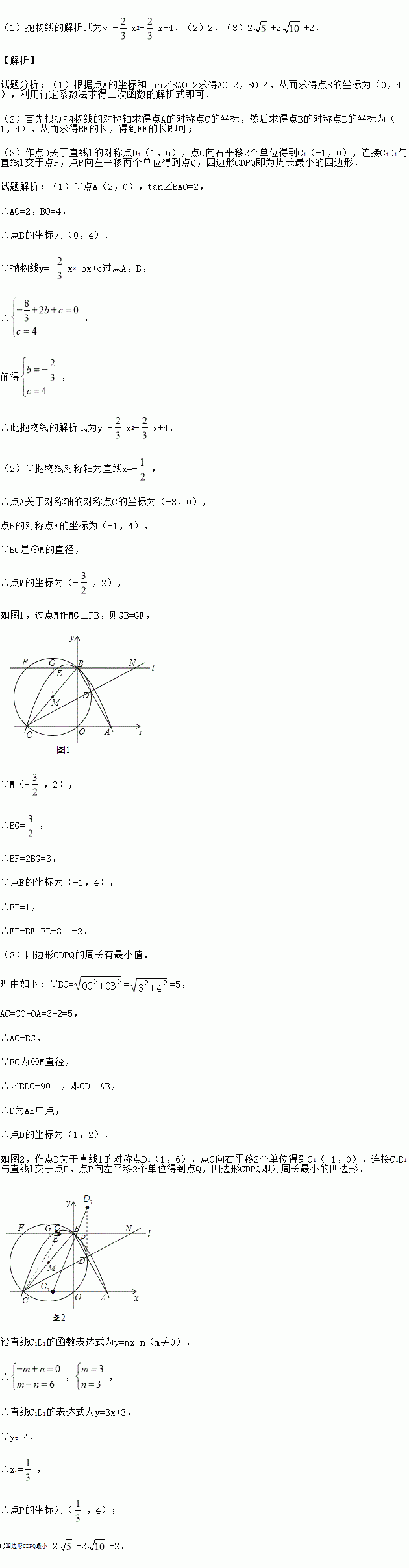 (1)抛物线的解析式为y=-x2-x+4.(2)2.(3)2+2+2. 【解析】 试题分析:(1)根据点A的坐标和tan∠BAO=2求得AO=2,BO=4,从而求得点B的坐标为(0,4),利用待定系数法求得二次函数的解析式即可. (2)首先根据抛物线的对称轴求得点A的对称点C的坐标,然后求得点B的对称点E的坐标为(-1,4),从而求得BE的长,得到EF的长即可; (3)作点...
