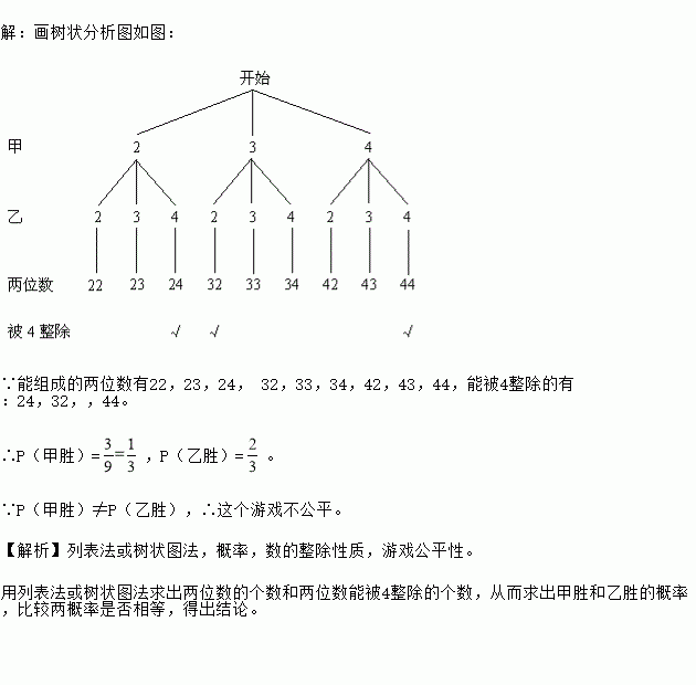 【解析】 画树状分析图如图: ∵能组成的两位数有22,23,24, 32,33,34,42,43,44,能被4整除的有:24,32,,44。 ∴P(甲胜)=,P(乙胜)=。 ∵P(甲胜)≠P(乙胜),∴这个游戏不公平。 【解析】列表法或树状图法,概率,数的整除性质,游戏公平性。 用列表法或树状图法求出两位数的个数和两位数能被4整除的个数,从而求出甲胜和乙胜的概率,比...
