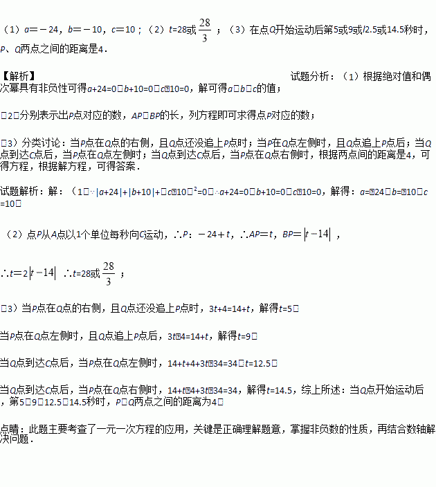 (3)当点P运动到B点时,点Q从点A出发,以每秒3个单位的速度向C点运动,Q点到达C点后,再立即以同样的速度返回,运动到终点A.在点Q开始运动后第几秒时,P、Q两点之间的距离为4?请说明理由.
