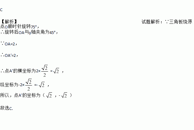 将含有30°角的直角三角板OAB如图放置在平面直角坐标系中,OB在x轴上,若OA=2,将三角板绕原点O顺时针旋转75°,则点A的对应点A′的坐标为( )
