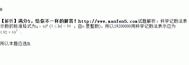 太阳的温度很高,其表面温度大约有6 000 ℃,而太阳中心的温度达到了19 200 000 ℃,用科学记数法可将19 200 000表示为( )