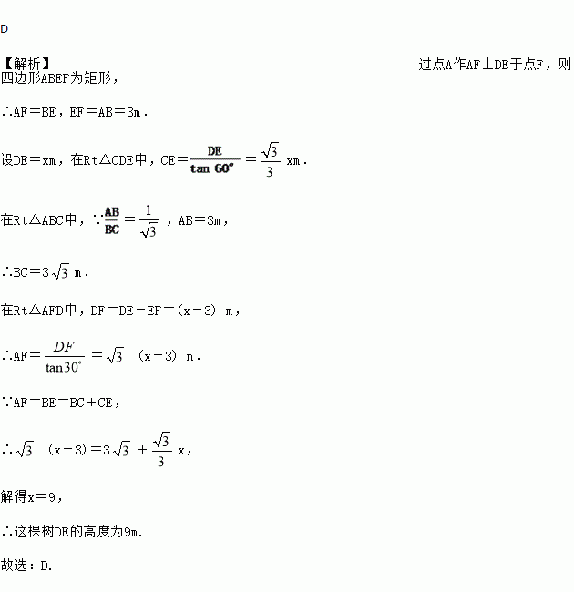 D 【解析】过点A作AF⊥DE于点F,则四边形ABEF为矩形, ∴AF=BE,EF=AB=3m. 设DE=xm,在Rt△CDE中,CE==xm. 在Rt△ABC中,∵=,AB=3m, ∴BC=3m. 在Rt△AFD中,DF=DE-EF=(x-3) m, ∴AF== (x-3) m. ∵AF=BE=BC+CE, ∴ (x-3)=3+x, 解...
