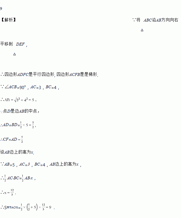 如图,在△ABC中,∠ACB=90°,AC=3,BC=4,点D是边AB的中点,将△ABC沿着AB平移到△DEF处,那么四边形ACFB的面积等于__________.