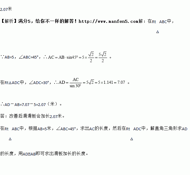 如图,某幼儿园为了加强安全管理,决定将园内的滑滑板的倾斜度由45°降为30°,已知原滑滑板AB的长为5米,点D、B、C在同一水平地面上.求:改善后滑滑板会加长多少?(精确到0.01)(参考数据: