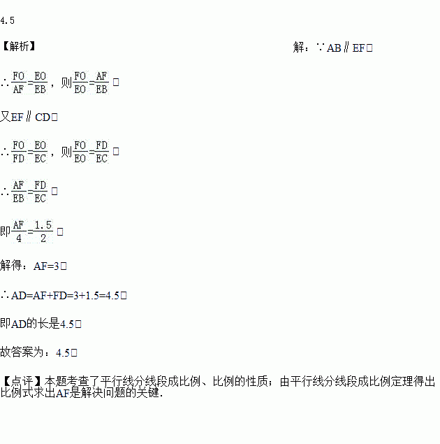 如图,已知AD、BC相交于点O,AB∥CD∥EF,如果CE=2,EB=4,FD=1.5,那么AD=________.