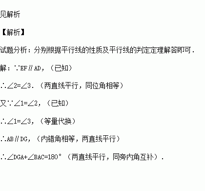 如图,EF∥AD,∠1=∠2.说明:∠DGA+∠BAC=180°.请将说明过程填写完成.