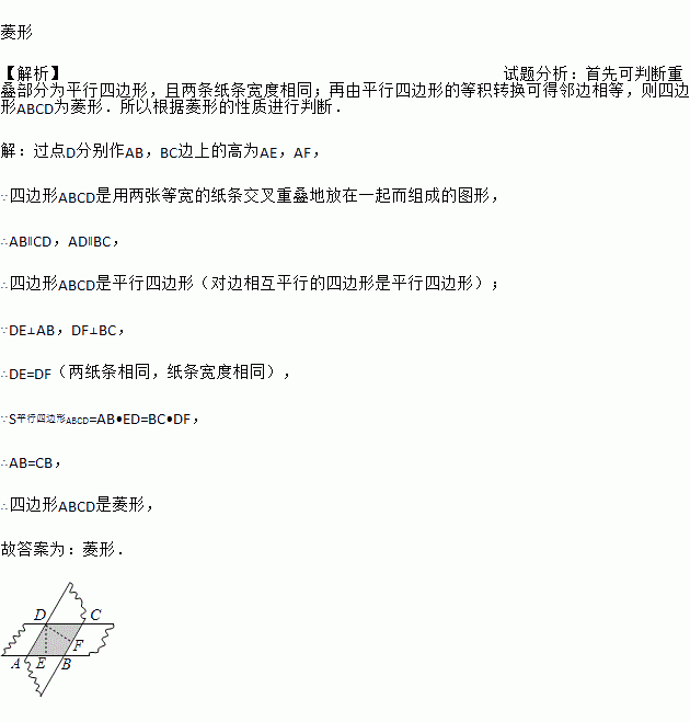 如图,剪两张等宽对边平行的纸条,随意交叉叠放在一起,转动其中的一张,重合的部分构成了一个四边形,这个四边形是________.
