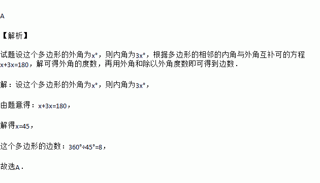 已知一个多边形的每一个外角都相等,一个内角与一个外角的度数之比是3:1,这个多边形的边数是